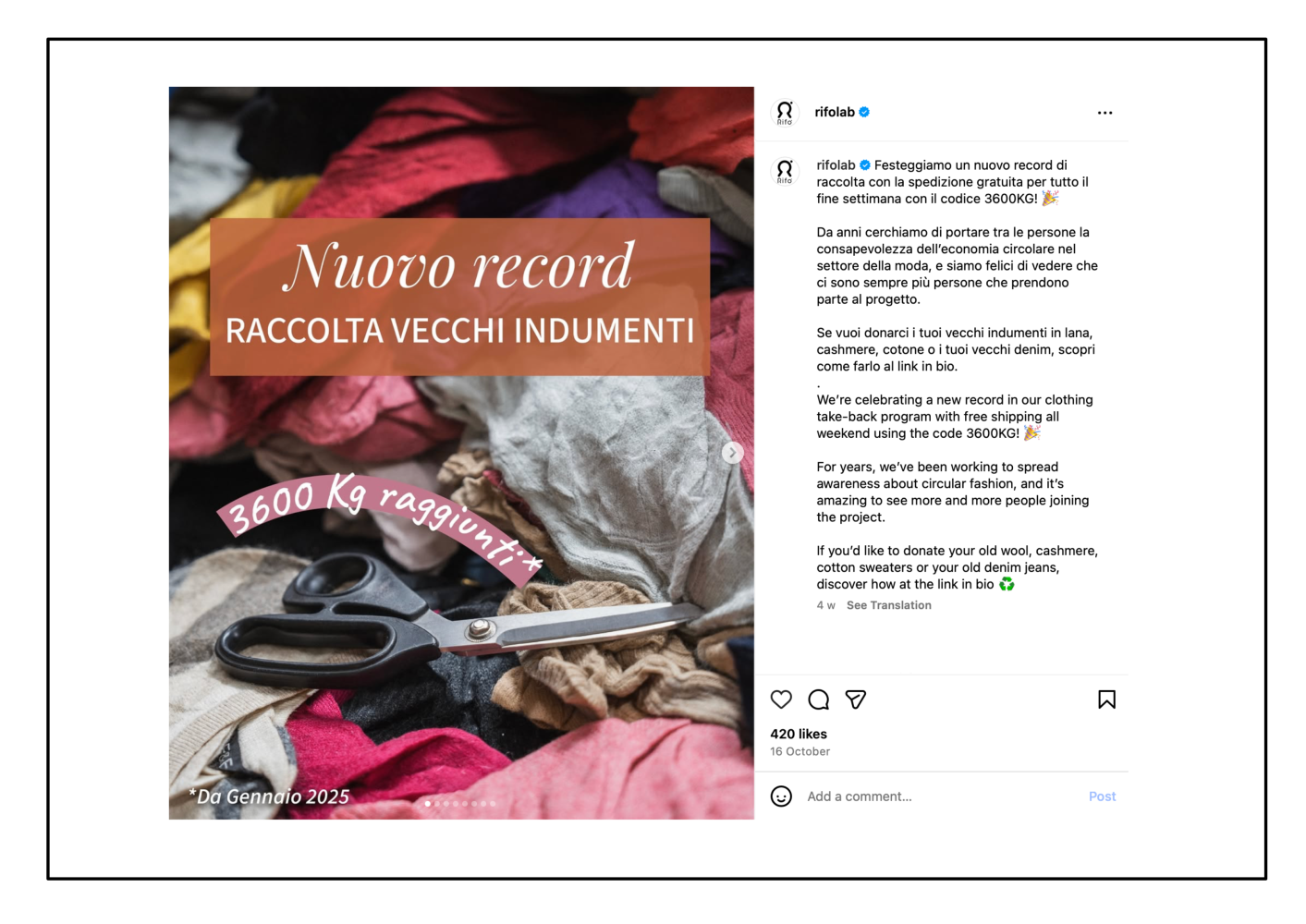 I couldn’t find any blame-based messaging. Instead, they focus on showing us a new perspective and sharing their regenerative journey. They celebrate small milestones with their community (like when they set a personal record for the amount of used clothing collected in 2025). That makes you want to join in, to send your clothes too if you haven’t already. They make this adventure into regenerative fashion feel exciting and cool, and who doesn’t want to be part of the cool crowd?
